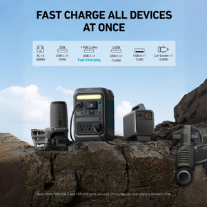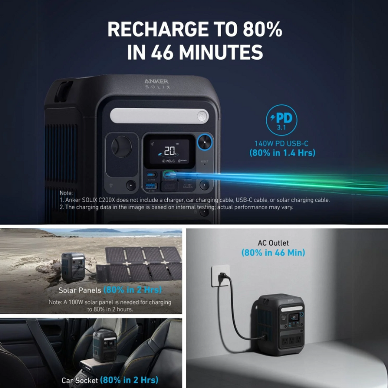 Recharge the SOLIX C200X in just 1.5 hours via AC power or pair with solar panels for off-grid charging.