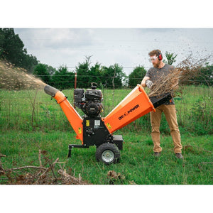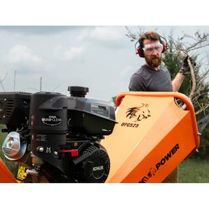 The OPC525 5-inch kinetic chipper is powered by a KOHLER Command PRO CH395 9.5 HP 277 cc engine and features dual swing chutes, double edge reversible high-speed cutting blades, bearing-mounted ATV tires and rims and built in toolbox with an extended load chute with safety e-stop. The engine delivers 13.9 ft/lb torque for superior cutting performance, and the dual V-belt direct drive and kinetic cyclonic drum pulverize up to 5-inch diameter trees. The tool-free dual swing chutes quickly open for easy drum access. The feed chute features dual integrated handles for easy equipment moving, and finally this machine comes equipped with a quick-drop stand, and a 1-7/8 inch ball removable tow bar to move around job sites with ease.