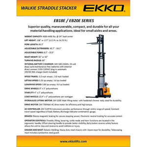 EKKO EB18E Full Powered Straddle Stacker 4000 lb Cap., 138" Height