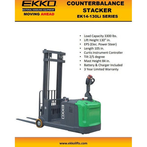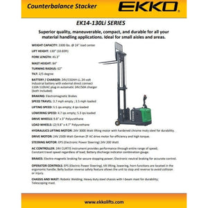 The EKKO EK14S-130Li Fully Powered Counterbalanced Walkie Stacker includes SIDE-SHIFTING and is designed with the combination of the versatility of forklift and a walkie stacker. It is ideal for loading and unloading trucks, loading docks, stock rooms, manufacturing floors and warehousing.