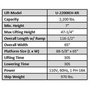 The iDEAL UTV Lift, model U-2200-IEH, with 2,200 lbs. of capacity is designed to lift UTVs and ATVs with ease. The 65 wide table will accommodate Trikes, ATVs and UTVs. The removable UTV side extensions have an integrated fold down access panel to improve technician productivity. We use a 110V electric hydraulic power unit that is built into the lift which provides smooth, safe and quick lifting and lowering. The lift is operated using a simple hand held pendant which raises, lowers into the locks and lowers, which eliminates the need to manually disengage safety latches. The perfect lift for everything from the UTV to the motorcycle. Wheel Chock and Vise Sold Separately.