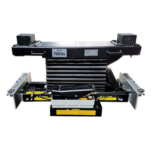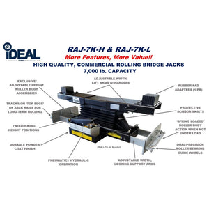 The iDEAL RAJ-7K Rolling Bridge is a high quality, automotive frame engaging 7,000 lbs. capacity, pneumatic/hydraulic operated, scissor-style rolling bridge jack, designed to be easily mounted on most four post or scissor lift's jack rails to expand the lift's service ability.