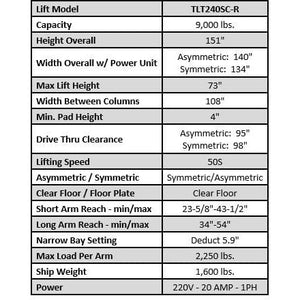 This lift is a commercial grade, asymmetrical clear floor lift with adjustable width and the ability to install rotated asymmetric (turned column) or standard asymmetric (straight column). The TLT240SC has three three-stage short arms, two-stage long arms, 4.3 min. pad height and versatile design allow easy lifting of passenger cars and light pickup trucks. Dual point lock release and durable chain-driven cylinders make the TLT240SC a great choice for the professional shop or the car enthusiast. At Launch, we provide unmatched support and availability for our complete product line of automotive lifts.