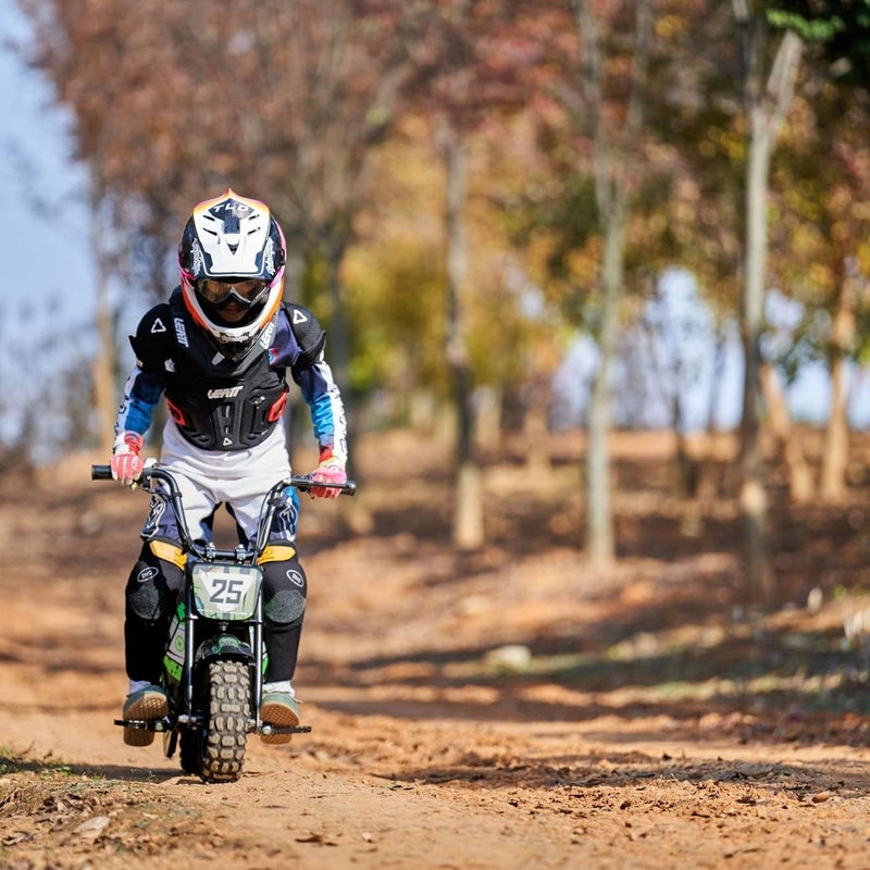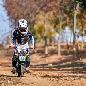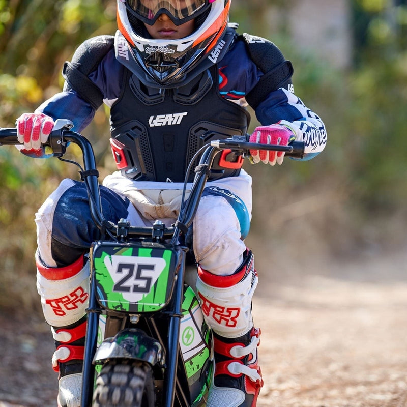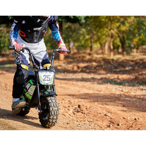 Just like the ones your parents used to drive, only safer and easier to use. Powered by a 250 watt electric motor, rugged chain drive and half twist throttle for safety. With its rugged steel frame and knobby tires, this mini bike is built tough to handle the roughest of terrain.