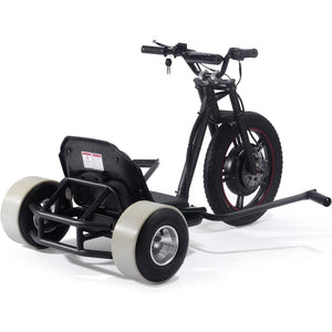This trike delivers high power and speeds for the ultimate drifting ride. Having a front powered wheel allows the rider to hold precise drifts versus a rear powered model. The front wheel uses an 800w 48v hub motor with a 48v 17.5ah Lithium Battery and reaches speeds of 25 mph. It includes long comfortable foot rests, front hydraulic disk brake, adjustable handle bars, a seat that folds down and easy changeable sliding plastic disks around the rear tires.