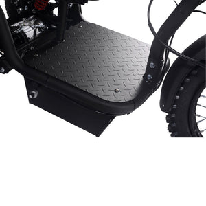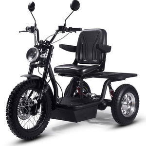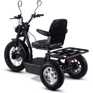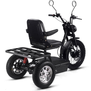 This a torque monster ready to conquer any terrain! This is a three-wheel electric scooter that you can ride while sitting or standing, this makes it very convenient for use at events, security and warehouse floor operations or for just plain fun! It's like a three-wheel Segway but at a fraction of the price! Powered by a 1800 watt servo motor with speeds up to 18 miles per hour. It can achieve a 20+ mile range on a full charge. It features a 24 inch pneumatic front tire, two 18 inch pneumatic rear tires and a comfortable seat with a backrest and armrests. This personal transporter is easy-to-operate with a twist throttle and front/rear hydraulic brake system. Comes standard with front and rear suspension, key, battery meter lights, headlight, mirrors, reverse and carrying rack.