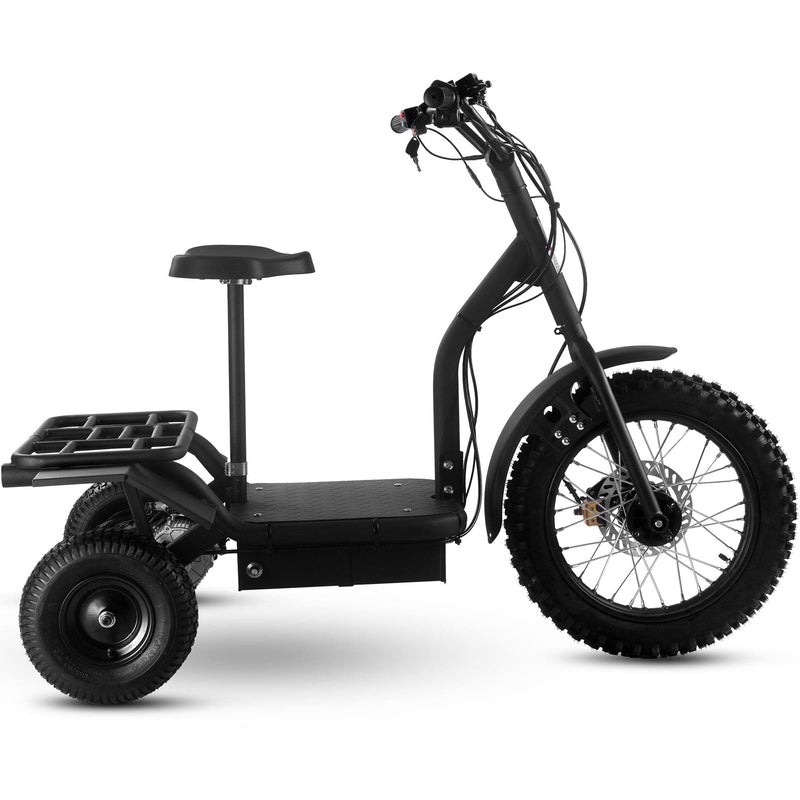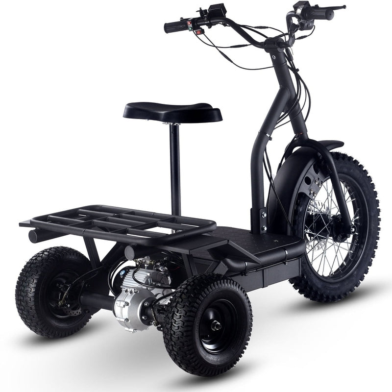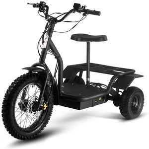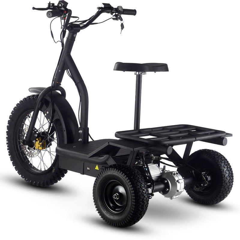 This a torque monster ready to conquer any terrain! This is a three wheel electric scooter that you can ride while sitting or standing, this makes it very convenient for use at events, security and warehouse floor operations or for just plain fun! It's like a three wheel Segway but at a fraction of the price! Powered by a 1200 watt servo motor with speeds up to 15 miles per hour. It can achieve a 20+ mile range on a full charge. It features a 24" pneumatic front tire, two 12" pneumatic rear tires and a removable seat. This personal transporter is easy-to-operate with a twist throttle and front/rear hydraulic brake system. Comes standard with key, battery meter lights, reverse and carrying rack.