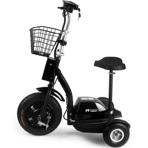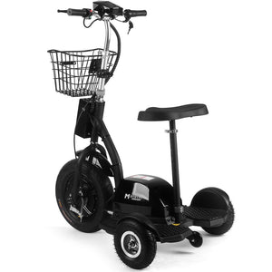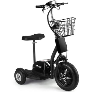 It's a three-wheel electric scooter that you can ride while sitting or standing, this makes it very convenient for use at events, security and warehouse floor operations or for just plain fun! It's like a three wheel Segway but at a fraction of the price! Powered by a 500 watt front wheel hub motor with speeds of 22 miles per hour. It can achieve a 20 plus mile range on a full charge. It features a 16" pneumatic front tire, two 9" pneumatic rear tires and a removable seat. This personal transporter is easy-to-operate with a twist throttle and left handle front drum brake system. Comes standard with key, battery meter light, front LED head light and carrying basket.