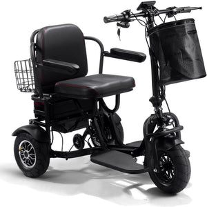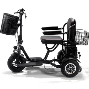 Its compact, three wheel styling makes for a sharp turning radius, 2 hub motors built into the rear wheels provide amazing torque for riding up inclines with its light weight durable frame made from Aluminum. The lithium battery is light weight and lasts longer than your standard competing lead acid models. Comes standard with headlight, rear light, key start, 3 forward speeds(with additional slow 2mph store speed), reverse, dual rear disk brakes, comfortable seat with arm rests and backrest, front & rear baskets and large 11 inch air filled tires to provide a comfortable ride.