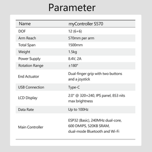 The myController S570 is a portable exoskeleton designed by Elephant Robotics for motion data collection. It can be used for myCobot 280¡¢myCobot 320¡¢myCobot Pro 630¡¢myAGV¡¢mechArm 270¡¢myArm M750¡¢myBuddy 280¡¢Mercury Humanoid Robot and also works with different types of robots for data capture, remote control, and development. This device enables researchers, developers, and educators to seamlessly integrate robotics into practical applications and learning environments.