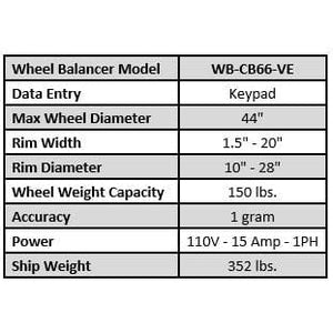 The CB66-VE Wheel Balancer is a highly accurate & reliable wheel balancing system designed to accommodate large rims up to 28" in diameter and overall wheel diameters up to 44". A 40mm Balancing Shaft provides incredible durability. At the same time, the exclusive Laser & Light feature illuminates the inside of the wheel at the unbalanced weight position, for convenient & precise wheel weight applications. The CB66-VE also comes standard with Multi-Mode Balancing options, along with Power Saving Mode, while allowing the user to choose between 5 Standard & 2 ALU Smart balancing configurations. A high-performance balancer at an unbeatable value!