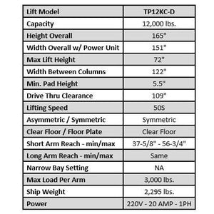 Tuxedo TP12KC-D 12,000 lb Two Post Lift -- Direct Drive
