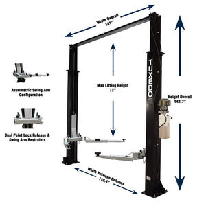 The TUXEDO TP9KAC-TUX 9,000 lb. Light Duty Two Post Lift is an economy designed clear floor vehicle lift with standard lift features including: asymmetrical swing arms, low profile 4 lifting pads, stackable height adaptors, saddle pad adaptors and dual point carriage lock releases. The one piece column with uprights combined with reliable chain drive cylinders make it the perfect service lift for passenger cars, light duty trucks & most SUVs. The automatic arm restraints and durable powder-coat finish provide an economically priced lift with all the features, all for a great value!